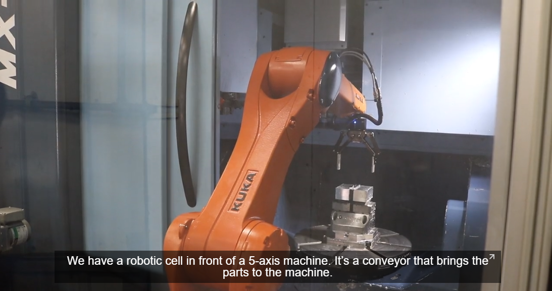 Précinov 在他們的 5 軸 CNC 機(jī)床前安裝了一個(gè)機(jī)器人單元。機(jī)器人將零件放在傳送帶上并將其放入機(jī)器中。如果需要,它可以翻轉(zhuǎn)零件,并在加工結(jié)束時(shí)將其取出。它基本上完成操作員的工作,而 Précinov 則聘請(qǐng)有資格從事完整生產(chǎn)設(shè)置的機(jī)械師。