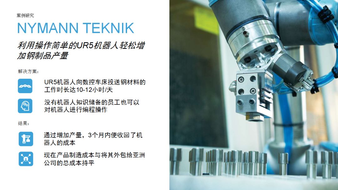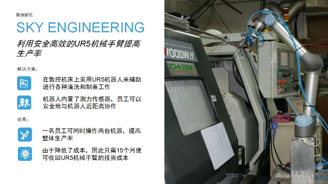 4、使用協作機器人,在降低運營成本方面有著顯著優勢:以項目集成為例,協作機器人編程、設置和部署的時長遠低于傳統工業機器人。無需安裝安全圍欄,省略大部分外部組件。因此可根據用戶來料和下料需求快速調試機器人方案,對現有生產流程無需進行大規模變動。協作機器人機床管理應用記錄在冊的最短投資回報期為34天。