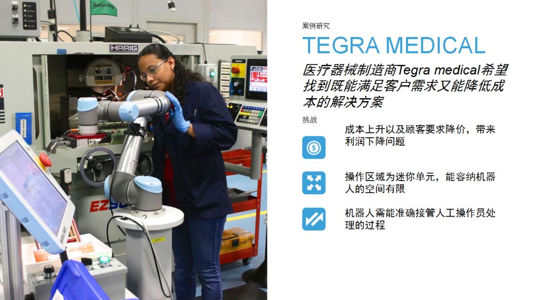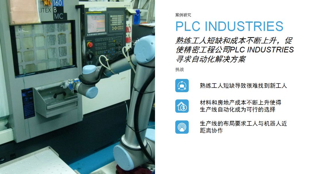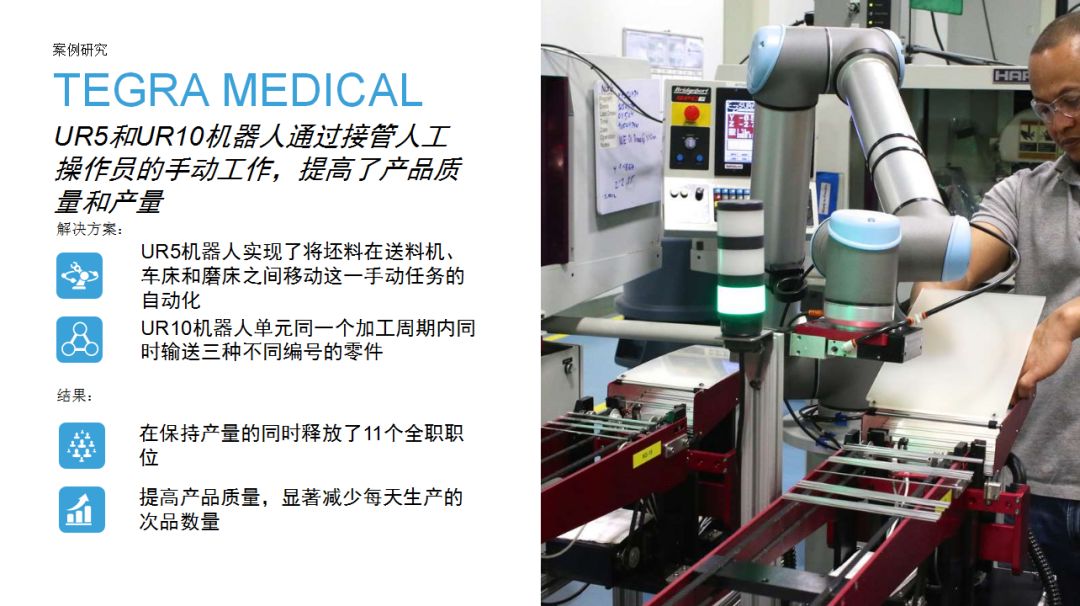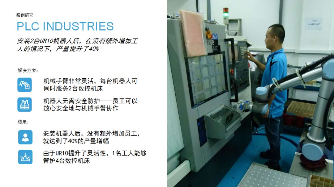 3、優傲機械臂的導入能夠替代原來照管機器人的工人,從這些崗位上轉移出來的人力可以從事有更高附加值的工作。同時,也降低了人手操作機床的危險系數。
