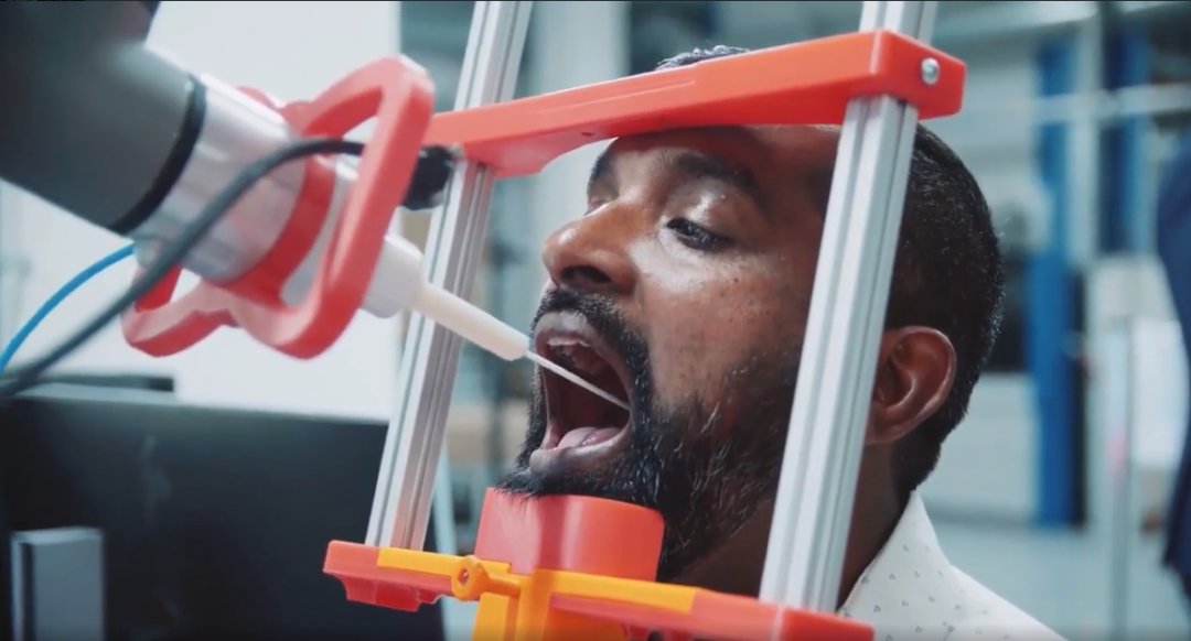 該機器人由南丹麥大學的機器人技術研究人員合作開發,裝配了UR3協作式機器人手臂,以及一個定制的3D打印末端執行器。檢測的過程本身非常簡單,首先掃描病患的身份證。機器人會立刻準備一個樣品盒,其中包括一個印有身份信息標簽的容器,然后機器人拿起棉簽。它會利用內置的視覺系統,識別出正確位置,并采集病人的咽部拭子。采集拭子過程結束,機器人會把樣本放入一個瓶子當中,然后擰上蓋子。瓶子隨后會被送到實驗室進行分析。整個過程總共需要7分鐘,而采集拭子本身只需要25秒。該系統于5月底在丹麥正式發布。